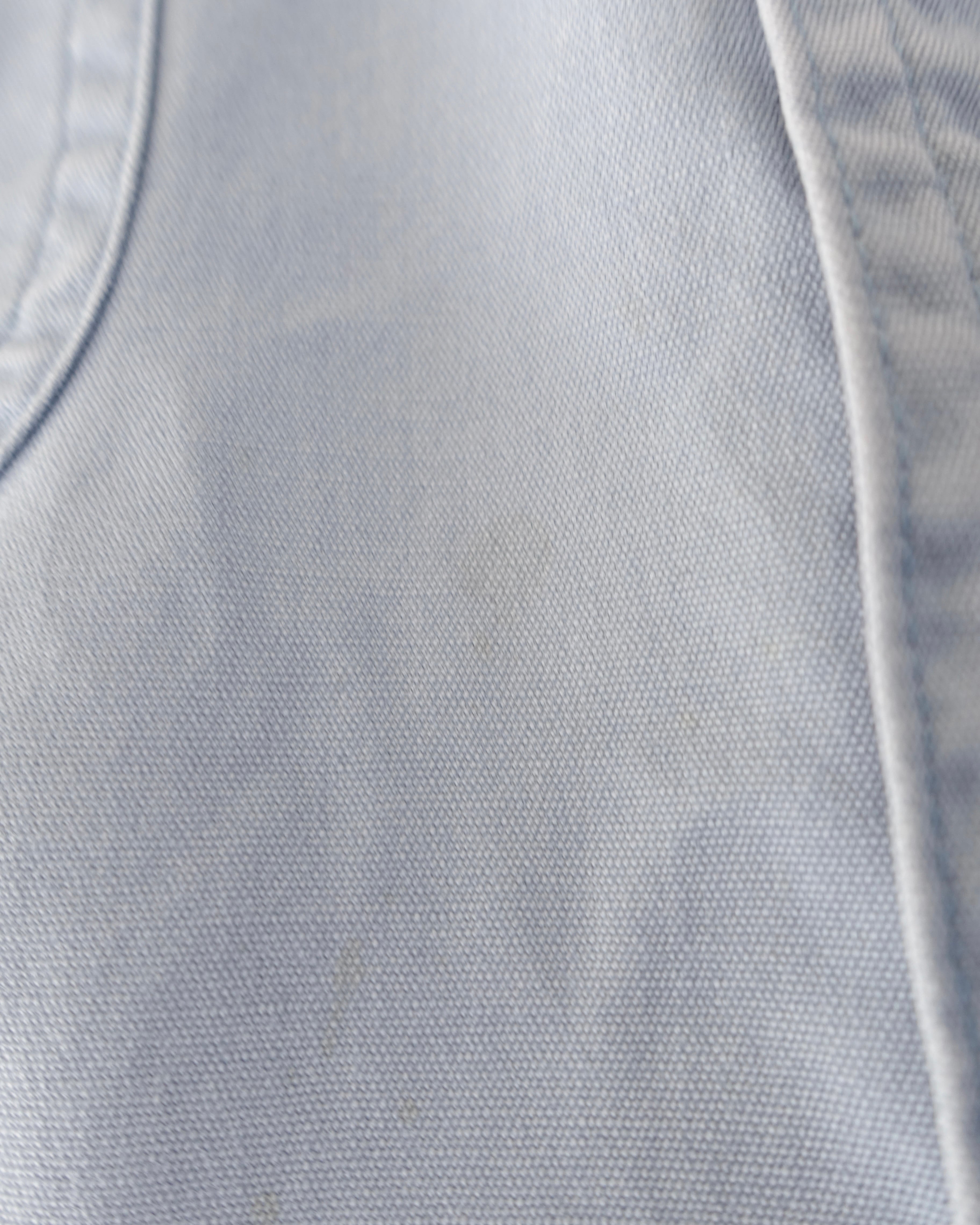 前面にとても薄いシミ。襟に変色。